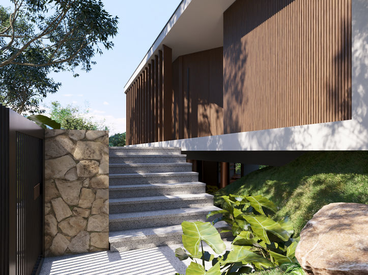 A Casa Jabuticabeira nasce da integração entre arquitetura e natureza. Implantada em um terreno em declive, adapta-se ao relevo de forma harmônica, valorizando a paisagem.